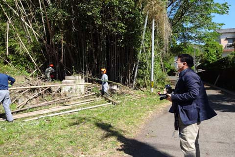 竹の伐採活動の新聞社取材